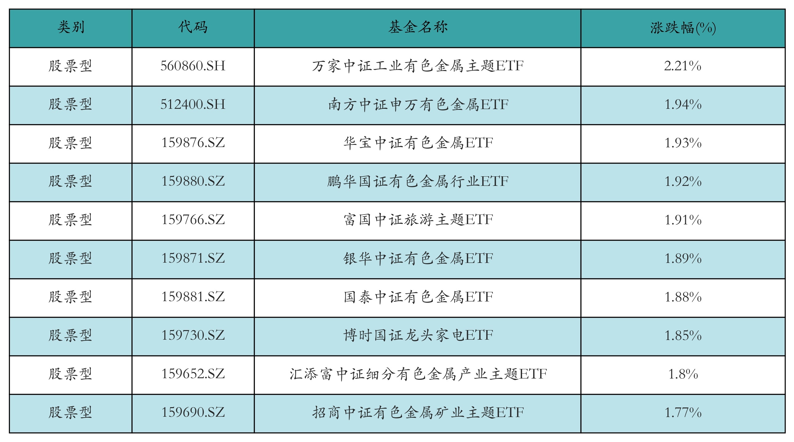 昨日股票型ETF涨幅最高的3支ETF及其收益率分别为:万家中证工业有色金属主题ETF(2.21%)、南方中证申万有色金属ETF(1.94%)、华宝中证有色金属ETF(1.93%)。涨幅前10详情见下表: