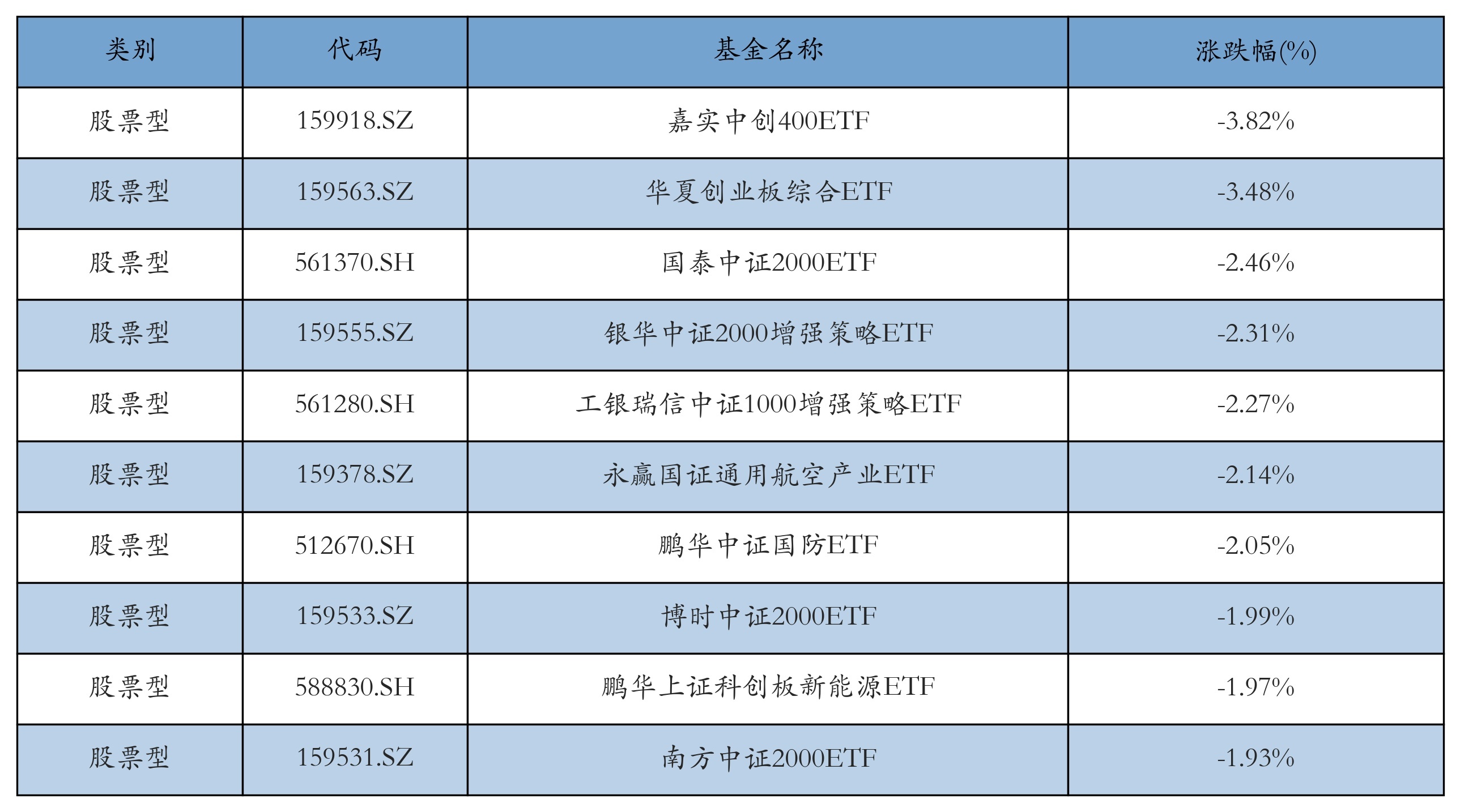 昨日股票型ETF跌幅最大的3支ETF及其收益率分别为:嘉实中创400ETF(-3.82%)、华夏创业板综合ETF(-3.48%)、国泰中证2000ETF(-2.46%)。跌幅前10详情见下表: