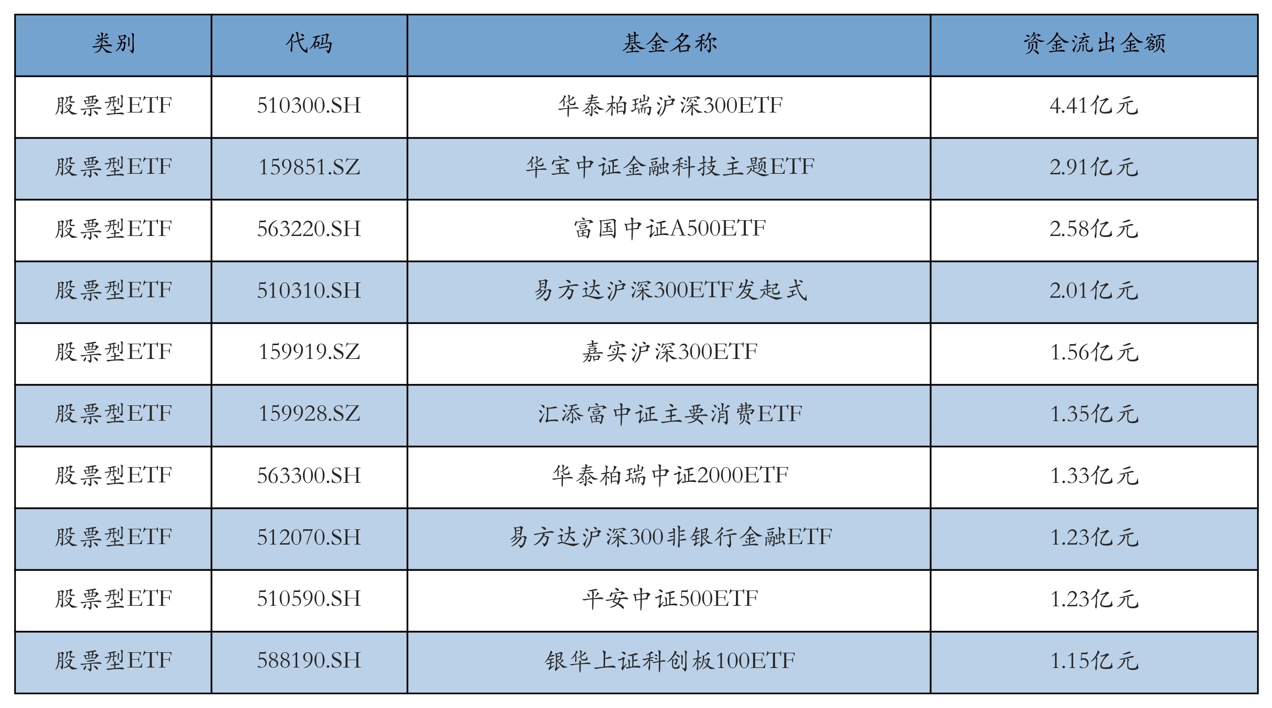 昨日股票型ETF资金流出最多的3支ETF及其流出金额分别为:华泰柏瑞沪深300ETF(流出4.41亿元)、华宝中证金融科技主题ETF(流出2.91亿元)、富国中证A500ETF(流出2.58亿元)。资金流出前10详情见下表: