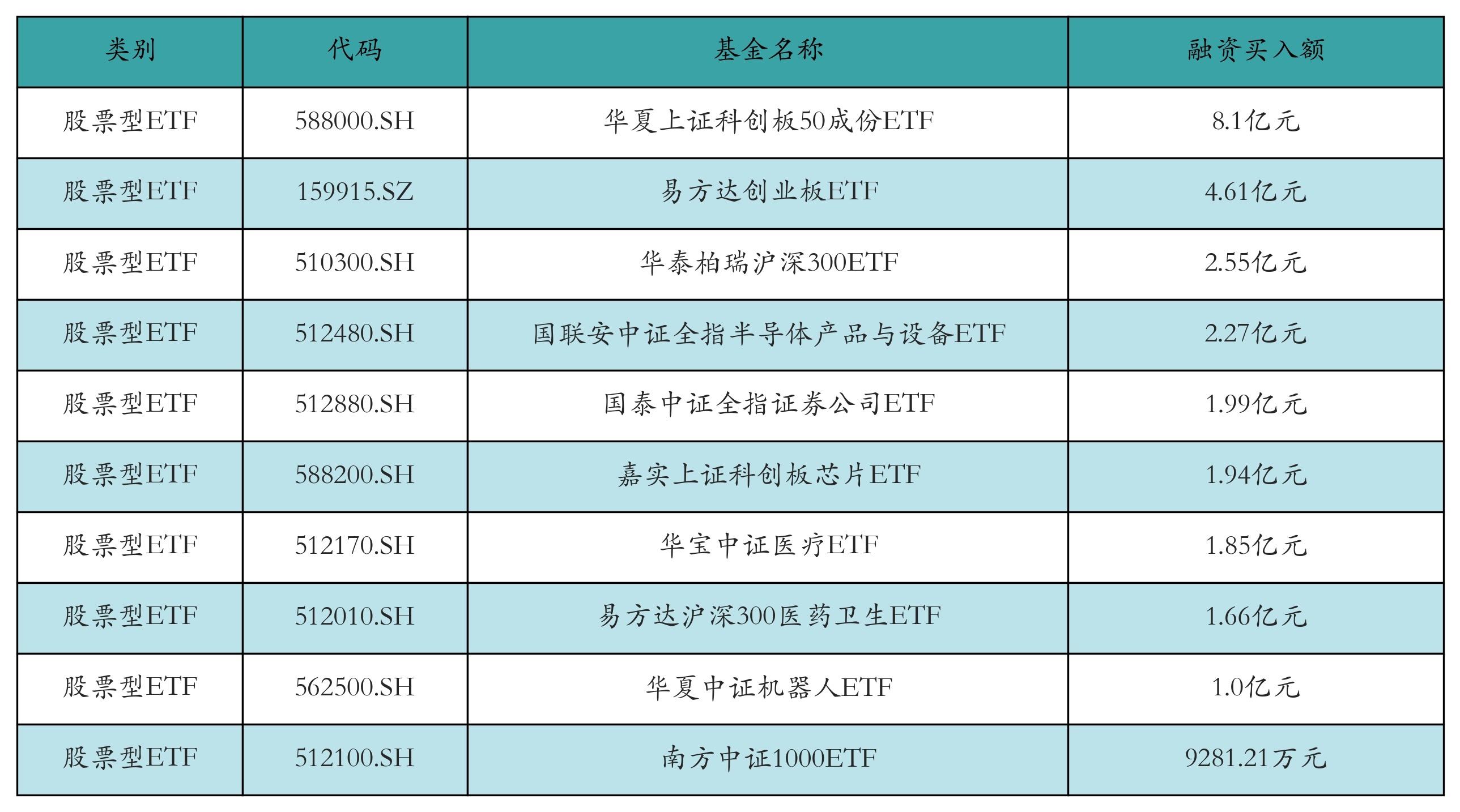 昨日股票型ETF融资买入额最高的3支ETF及其买入金额分别为:华夏上证科创板50成份ETF(8.1亿元)、易方达创业板ETF(4.61亿元)、华泰柏瑞沪深300ETF(2.55亿元)。融资买入额前10详情见下表: