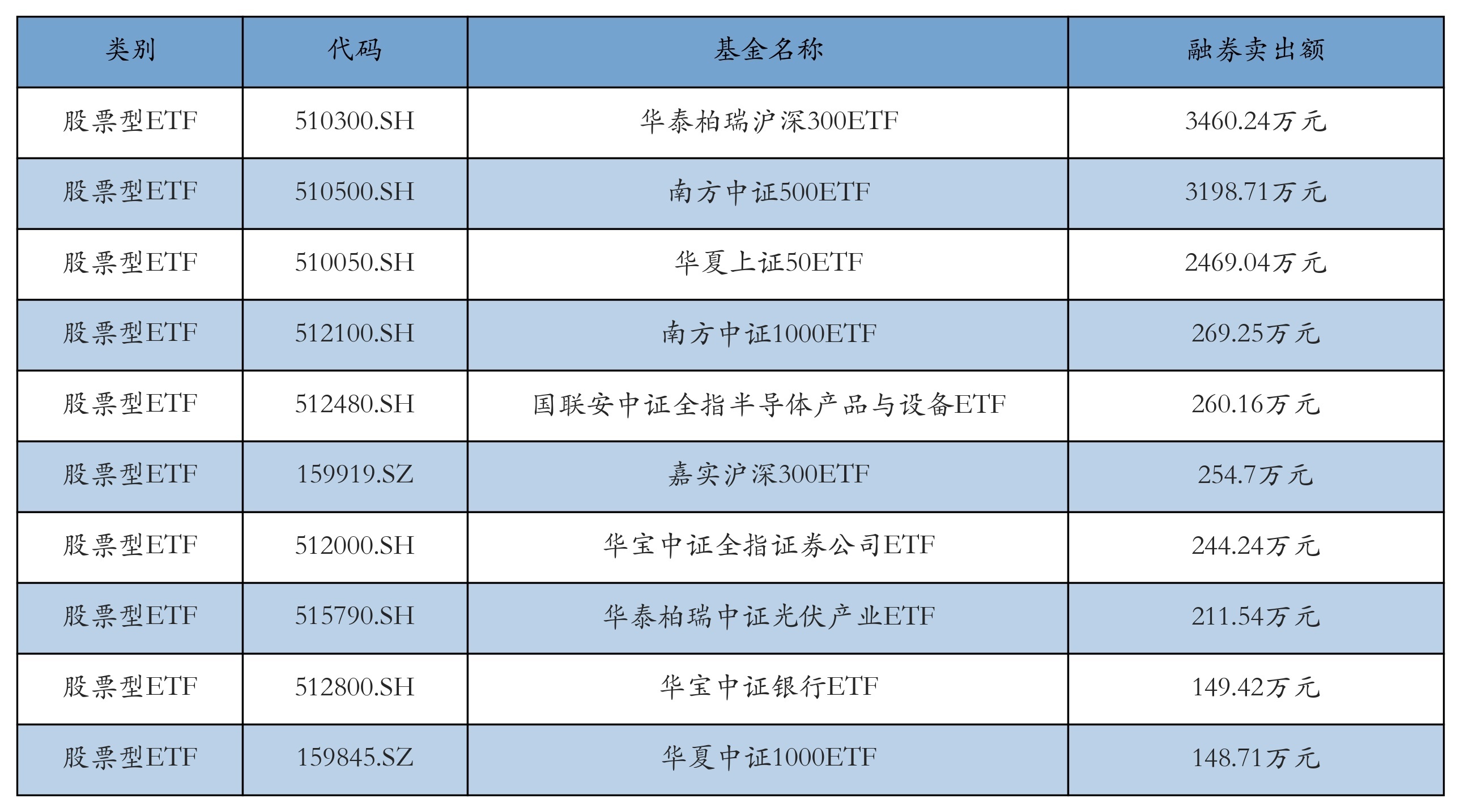 昨日股票型ETF融资卖出额最高的3支ETF及其卖出金额分别为:华泰柏瑞沪深300ETF(3460.24万元)、南方中证500ETF(3198.71万元)、华夏上证50ETF(2469.04万元)。融券卖出额前10详情见下表: