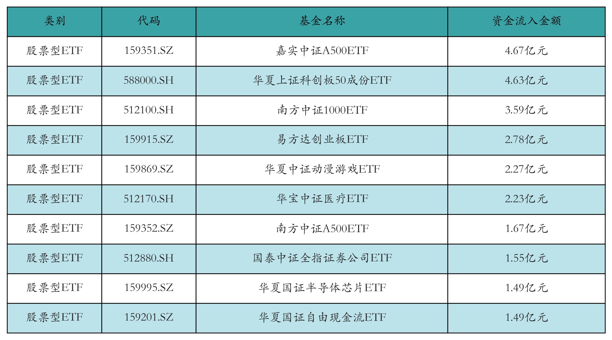 昨日股票型ETF资金流入最多的3支ETF及其流入金额分别为:嘉实中证A500ETF(流入4.67亿元)、华夏上证科创板50成份ETF(流入4.63亿元)、南方中证1000ETF(流入3.59亿元)。资金流入前10详情见下表: